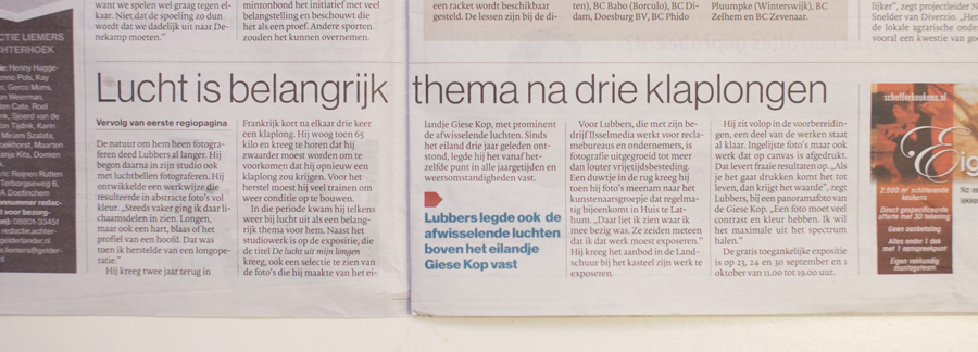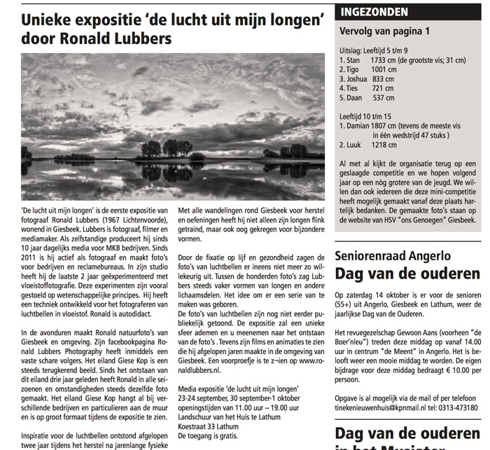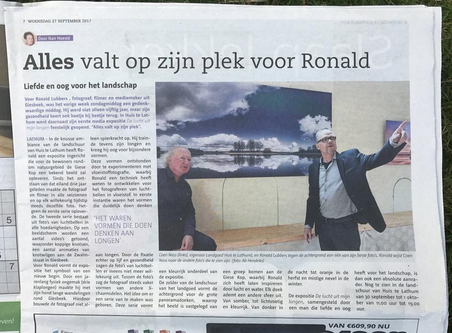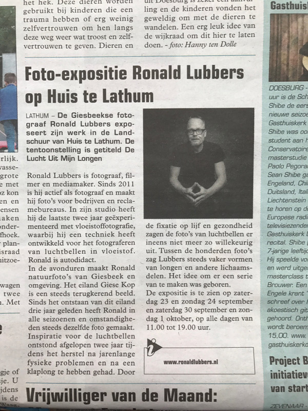 Afgelopen maanden heb ik regelmatig (7x) de media gehaald met de expositie ‘de lucht uit mijn longen’. Mijn eerste expositie was in de landschuur van Huis te Lathum. Eigenaar Coen Nass stelde deze prachtige ruimte ter beschikking en samen met mijn vaste assistenten is de week voor de expo het geheel ingericht. De expositie mag een succes worden genoemd met op alle dagen veel bezoekers en veel verkochte werken. Zowel van het eiland Giese Kop als van de luchtbellen. Nogmaals mijn grote dank aan alle mensen die hebben geholpen dit tot een succes te maken. Zonder jullie hulp was dit niet zo groot geworden. Indien u meer informatie wilt over de werken kunt u hier kijken. Een wachtwoord kunt u bij mij opvragen.