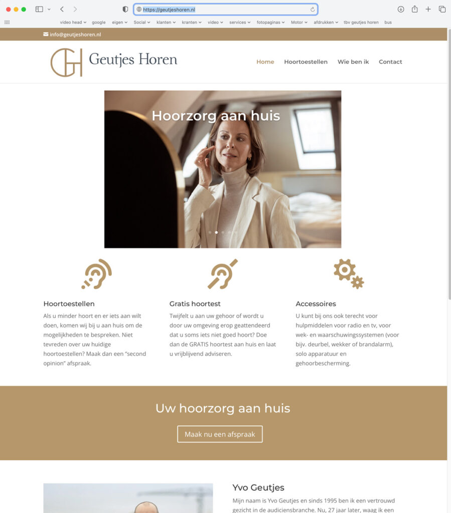 Voor audicien aan huis Yvo Geutjes heb ik een website ontwikkeld en foto’s gemaakt. Geutjes Horen is audicien aan huis en komt bij klanten thuis. Een hoormeting en het aanmeten van gehoorapparaat gebeurt bij mensen thuis. Wel zo handig.
