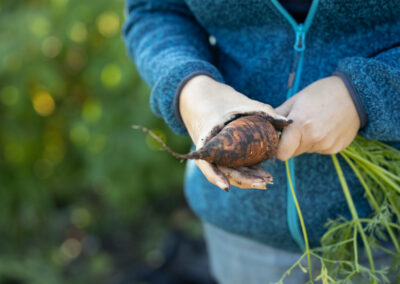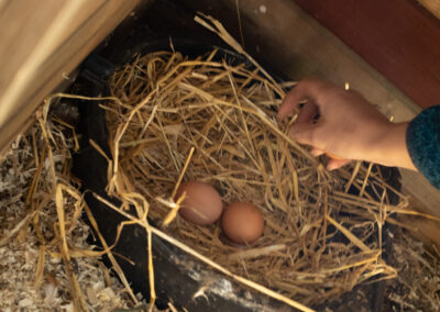 Albertine is voorzichtig gestart met de productie van groenten en andere levensmiddelen. Geen grote investeringen nog maar kleine stapjes om zo het risico te beperken. Ze is nu vooral bezig om een goede bodem te creëren op een natuurlijke wijze. Geen bestrijdingsmiddelen dus maar het vinden van de juiste balans tussen de verschillende gewassen. Robin heeft uit een oude betonmolen een installatie gemaakt om grond te reinigen van oude wortels. Een stuk land van zo’n 30×20 meter is nu in gebruik als moestuin waar de eerste groenten worden verbouwd.