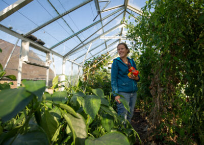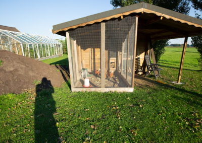 Langs het land hebben ze een hele rij wilgen geplant. Deze bevorderen de biodiversiteit en dienen als natuurlijke afscheiding en beschutting voor insecten en dieren. Uiteraard heb je bijen nodig en Robin heeft de taak van Imker op zich genomen. Achter op het land staat inmiddels een mooie verzameling kasten met bijen.