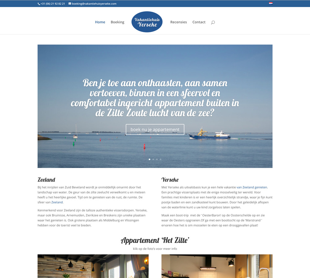 In mei en juni heb ik samen met een zeer goede vriendin een website ontwikkeld voor een nieuwe vakantiewoning in Yerseke in Zeeland. Met aanwijzingen vanaf Giesbeek heeft een aanstormend fotograaf heel goede HDR foto’s gemaakt van de twee appartementen. Deze bronfoto’s heb ik vervolgens bewerkt en tot mooie platen gemaakt. Deze foto’s worden ook geplaatst op oa booking.com, Expedia en Airbnb. De website is ontwikkeld op basis van het top thema Divi van Elegant Themes. De teksten zijn geschreven door Ellen en het logo en andere grafische ontwerpen zijn van mijn hand. Medio juli wordt een module van EasyBooking geïmplementeerd om alle boekingen soepel te laten verlopen.