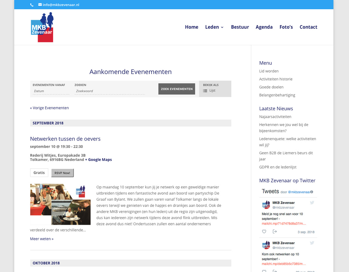 Voor ondernemersvereniging MKB Zevenaar hebben we een complete website ontwikkeld. De website bevat veel verschillende functionaliteit en is geschikt gemaakt om door drie gebruikers te worden onderhouden. Allereerst is een een systeem waarin evenementen worden gemanaged. Via een ticket systeem kunnen mensen zich aanmelden en informatie opgeven. Bij aanvang van een evenement kunnen de verschillende gebruikers van de website een overzicht uitdraaien met daarop de deelnemers maar ook aanvullende informatie zoals voorkeuren tav eten of andere parameters die in de ticket worden aangegeven. Op wekelijkse basis worden artikelen gepubliceerd met tekst of foto content. MKB Zevenaar heeft een beheer- en onderhoudscontract afgesloten met IJsselMedia om maximale werking te garanderen.