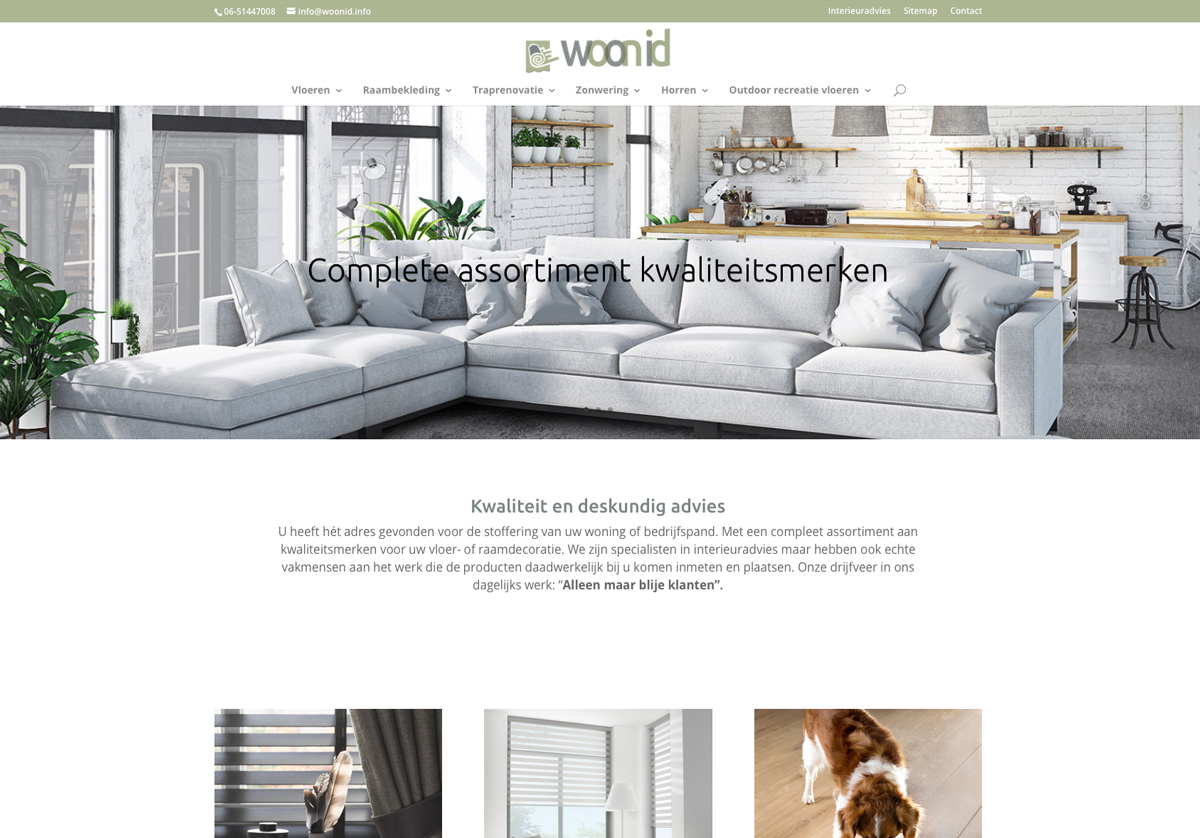 Voor de firma Woonid uit Lobith hebben we dit voorjaar een nieuwe website ontwikkeld. Woonid zorgt voor stoffering van woningen en bedrijfspanden. Naast advies aan klanten leveren ze een groot assortiment kwaliteitsmerken vloer- en raamdecoratie. Op basis van webthema Divi hebben we een nieuwe responsive website ontwikkeld waar alle merken een plek hebben. Het bestaande logo van Woonid is doorontwikkeld en met nieuwe fonts is het wat eigentijdser gemaakt.